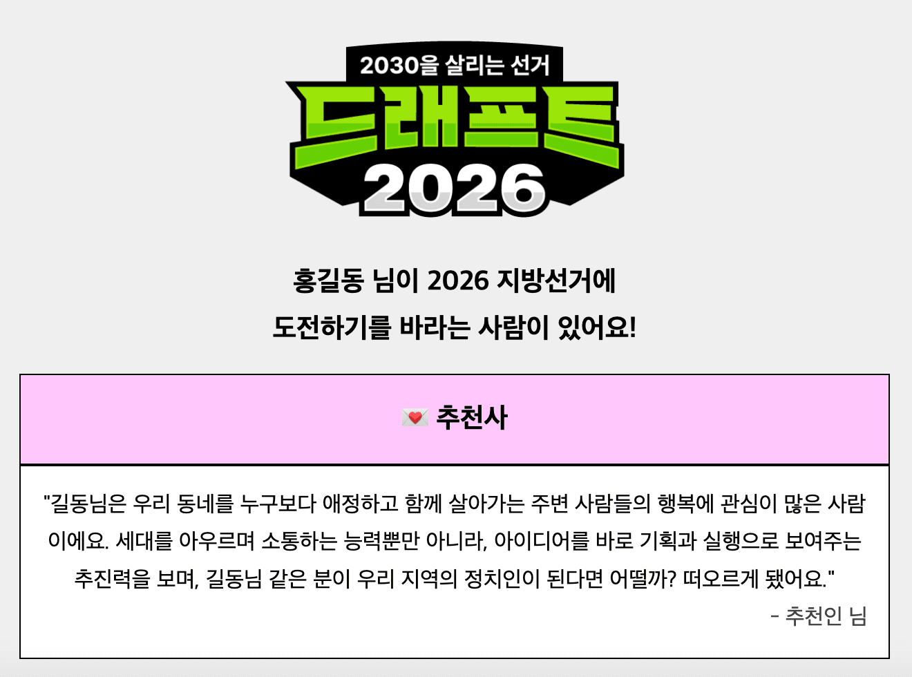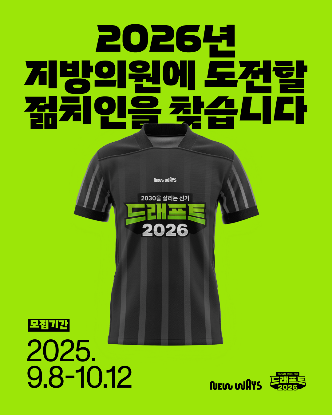 뉴웨이즈가 젊치인 인재 선발 트랙인 ⟨드래프트 2026⟩을 통해 내년 지방선거에 출마할 후보자를 모집하고 있어요. 만 39세 이하 젊치인이 도전하고 - 유권자가 응원하고 - 유권자가 필요로 하는 문제가 빨리 해결되게 만들 거예요. |